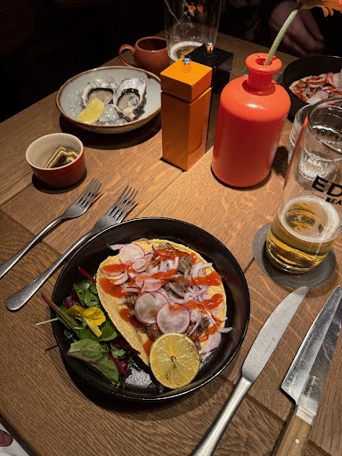 Read moreThe hostess was very friendly and helpful, sad enough this was almost the highlight of our visit. The ambiance in the restaurant is great, already from the outside it looks attractive, which has for sure been extended to the inside. It was busy, so I would understand some things can go not so smoothly. We had to wait for a long time before we could order anything, only to be a bit disappointed. As a starter we ordered bread with dips, but the main course was on the table before the bread. The dip(s?) was something that resembled wasabi mayonaise. I like that on itself, but as a dip for bread (which was dry and a bit burned) it was not to my tasting. We ordered some drinks, but the server was a bit slow, one drink came much later vs the rest. The main courses looked good, but taste was average at best. The seasoning of the dishes was poor and the meat was not cooked properly on several examples (dry chicken, almost raw and cold steak). The quality of the meat however was very good! We ordered some fries, but they never came. Our main server was not able to keep up the pace with her tables. Again we had to wait relatively long for the check. I would like to believe that this restaurant is better. I would probably try it again, just to be sure. But for today I was...