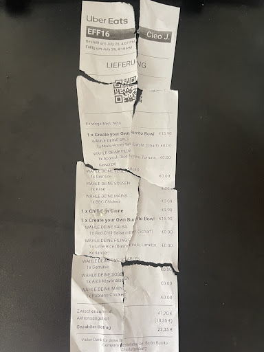 My partner and I both really love their burrito bowls. We've been getting them consistently for the past few years. What we love even more are the bags of tortilla chips that come with them—so fresh and crisp and flavourful, and much better than any other tortilla chips I've had at the various Mexican restaurants around Berlin. We've also had their burritos a couple times and those were also good. We usually get the lime tofu or chicken, with different types of rice, then a lot of different toppings.