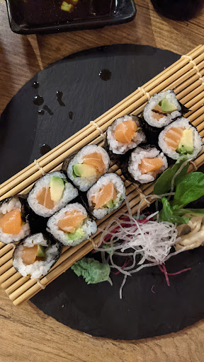 Read moreWir waren dort zu dritt essen und waren schon beim Betreten des Ladens sehr überzeugt. Die Einrichtung wirkt hochwertig und die Atmosphäre lässt einen wissen, dass man hier in einem jungen hippen Sushi-Restaurant sitzt und nicht in einer erweiterten Lieferservice-Küche. Wir einigten uns recht zügig auf eine der Sushiplatten-Angebote. Die Preise waren mit 50 Euro für eine Drei-Personen-Platte auch in Ordnung. Als erstes bestellten wir die Getränke. Diese wurden auch recht schnell geliefert und waren preislich auch in einem ordentlichen Rahmen. Das bestellte Wasser wurde in einem schön dekorierten Glas geliefert und war recht hübsch anzuschauen. Beim Weißbier kann man ja vom Prinzip her nichts verkehrt machen und somit gab es auch hier nichts auszusetzen. Ich selbst bestellte mir eine Tasse Genmaicha-Tee. Dieser wurde lose in der Tasse geliefert, so dass die gerösteten Reiskörner oben auf dem Tee schwammen. Das tat zwar einiges für den Eindruck, erschwerte jedoch das Trinken des Tees. Als erstes wurden uns anschließend die bestellten Vorspeisen, ein Algensalat und einmal Frühlingsrollen gebracht. Auch diese waren optisch wieder in einem einwandfreien Zustand und auch geschmacklich war nichts auszusetzen. Der Algensalat war wie üblich mit Sesam gewürzt und auch nicht so matschig, wie man in sonst aus manch anderem Sushi-Laden kennt. Auch die Sommerrollen waren ohne Makel. Nach doch deutlicher Wartezeit wurde unsere Sushiplatte geliefert. Optisch waren wir direkt begeistert, da die komplette Platte wunderschön dekoriert war. Die arrangierten Sushirollen waren mit Sojasprossen und Soße dekoriert. Es wirkte ein wenig wie eine Dschungellandschaft auf einer Schieferplatte. Nachdem wir uns satt gesehen hatten wurde angefangen das Essen zu verspeisen. Geschmacklich spielte das Sushi für Berliner Verhältnisse in der oberen Liga mit. Der Fisch wirkte sehr frisch und auch die Sojasprossen werteten den Geschmack auf. Es gab auch auf der Platte nicht nur das übliche Standard-Sushi-Programm sondern auch Rollen abseits der normalen 0-8-15 Makis. So gab es auch Inside-Outs mit Tempura und Rollen mit Frischkäsekreationen. Insgesamt gingen wir gut gesättigt mit qualitativ hochwertigen Sushi aus dem Restaurant. Auch preislich waren wir mit 80 Euro für 3 Personen inklusive Getränke sehr zufrieden für den...