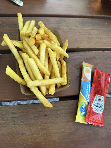 I regularly attend the area to go SUPing with my family and we always go here after for a beer and some food. They appear to have a set menu (on chalk boards) but i have only ordered the half chicken and bratwurst, and cake and everything has always been great; the pommes is delicious and has always been fresh. There is also ice cream for for sale as well (pre-packaged). Service can be slow sometimes and the line can be long but it generally moves pretty steadily.