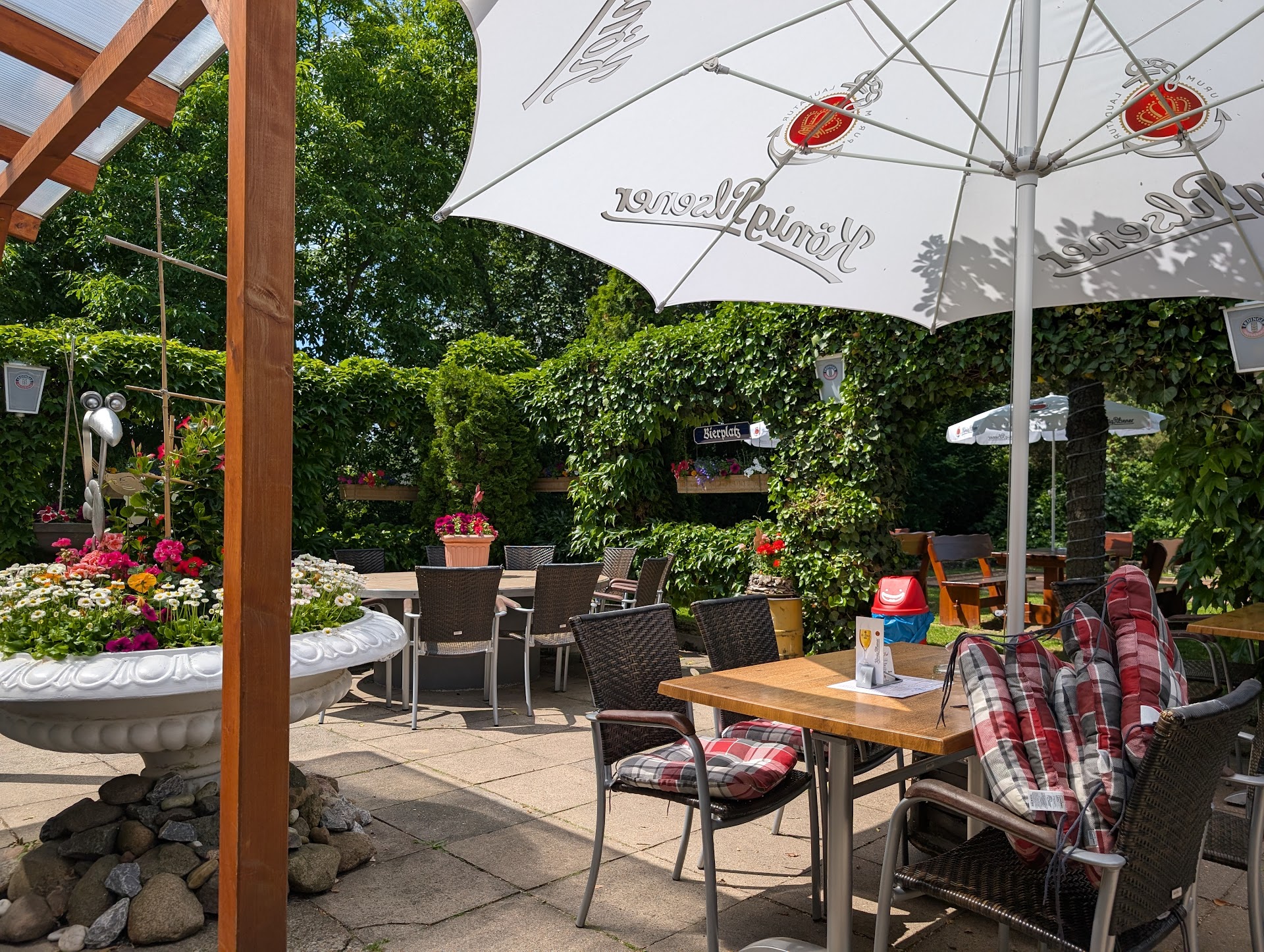 Ich hatte Glück, wenig besetzt, viel Platz, auch für mein Rad, geile Räder dürfen mit reingenommen werden, also draußen im Biergarten. Total gemütlich, mit Sitzkissen und Sonnenschirmen.