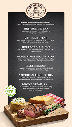 At Block House, the goal is to rush every customer out again as quickly as possible, even when the restaurant is half empty. The starter arrived after (literally) 60 secondes which suggests it must have been standing ready-made in the kitchen for some time already. We ordered a bottle of white wine to start with but halfway our first glass and with the starter half finished the waitress suddenly showed up with our steaks. After politely inquiring why she would bring our main course halfway our starter she informed us that this was how it works at Block House and left the steaks on our table to go get the manager. He offered us the bottle of wine and promised that they would grill us new steakes when we were ready and they would throw these away. Despite this ruining our plans, and forcing us to drink Riesling with our steak, we decided throwing them away was too wasteful so we ate them. The steaks were very well cooked, perfect medium-rare, we received apologies and an explanation so for us, although we wont go here again, everything was solved.