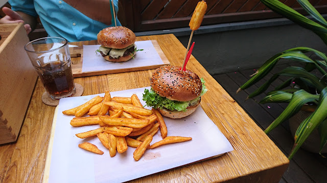Die Brötchen sind laut eigenen Angaben hausgemacht und würden aufgrund ihrer Größe viel Platz für einen gut belegten Burger bieten. Doch man wird enttäuscht. Das Graffiti an der Wand zeigt eine Illusion von einem Burger, den man hier nicht bekommt. Flach mit viel Brot, welches geschmacklich gut ist - keine Frage, aber ich bin hier nicht beim Bäcker. Das Patty ist zwar gut gewürzt, aber mir persönlich zu trocken. Und dann erinnert der spärliche Belag eben an die Großkonzerne (McD. & B-King): eine Tomate, zwei - drei Gürkchen, ein Löffelchen Salat und eine Scheibe Käse... Da habe ich mehr erwartet. Das Verhältnis stimmt vorne und hinten nicht. Außerdem unterscheiden sich die Burger kaum in der Zusammenstellung und dadurch finde ich die Preisunterschiede nicht gerechtfertigt.