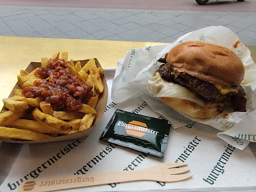 Read moreWe ate Fleischermeister burgers from Burgermeister while in Berlin for the 2023 Berlin Marathon. They were delicious! The Fleischermeister comes with two ground beef patties, grilled onions, and double cheese. The beef is high quality and it is cooked with a slight peppery finish and a bit of a crusty exterior. We ordered fries along with our burgers and they, too, were great. They had a satisfying fluffy potato interior and a delicate crunchy exterior. We also ordered some cookies with our meal. Burgermeister has two varieties: blueberry cheesecake and double chocolate peanut chip. They claim that they are "fresh every morning from our own Berlin bakery." It's that focus on freshness and quality that puts Burgermeister...