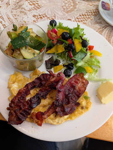 It is pretty much the only place for breakfast in this area. Fun Café, good croissants and cake. She doesn't make a "proper" breakfast anymore, but you can still get a nice little breakfast in, with eggs, croissants, bread rolls, and jelly, some sorts of sausage are also available. Generally friendly owner, you do have to get used to the Berlin style a bit though, sometimes Berliners can seem a bit unfriendly at first, but they don't mean to be. It's just how Berliners have to talk to people they don't know to get them to do what they want, e.g., "please close the door properly and without slamming it" so the customers seem not to close the door or if they do to slam it...