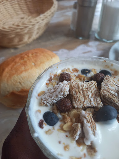 I had 2 brotchen, butter, Frisch Käse , Stuck Käse, Joghurt Mit Granola, gurken und Tomaten and a large Cappuccino.