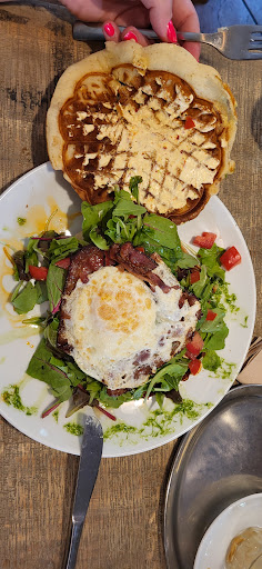 Definitely a lot of options for breakfast/ brunch (two-three vegan, but nothing too fancy). We got two different type of waffle (we kindly ask to make one of them vegetarian). They were okay, mozzarella was reaaaally cheap quality, for the price of the waffle (almost 15€) I was not expecting it. I was also a bit confused as my waffle was quite spicy. As I asked the waitress she said they did put some chilli flakes/ chilli oil. It was not a problem for me, but maybe it is better to specify it in the menu. They have a couple of table outside, the atmosphere was nice. All together it was an okay breakfast, not sure if it was...