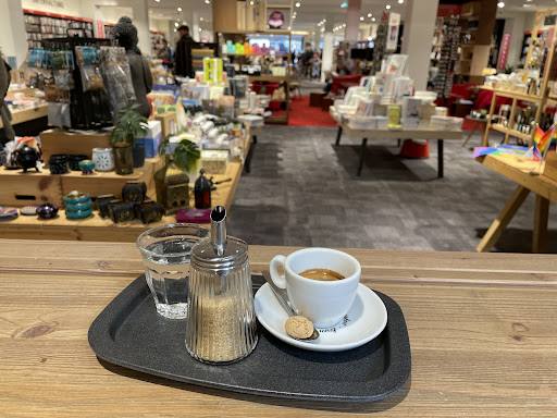 Espresso with a glass of water. Comfortable siting area with choice of chairs and table or high chairs arranged bar style. Bring your Hugendubel reading club membership card to get an extra discount and collect...