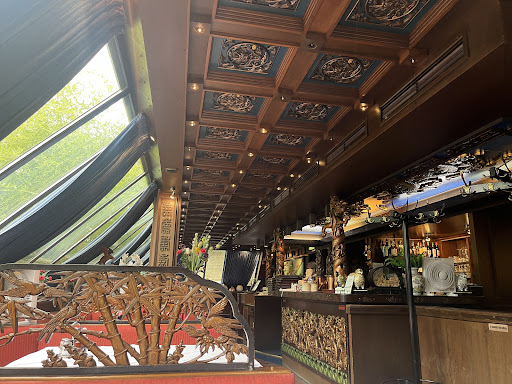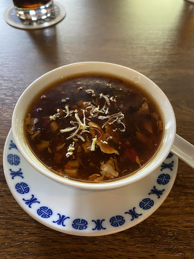 Read moreHübsches China-Restaurant 🉐️🍽🥢🏮🎎 🌾🐼 im Souterrain mit schrägen Fenstern und typischer chinesischer Holzschnitzerei an Decke, Wänden und Raumtrennern sowie bunten Bildern, Drachen und lachenden dicken Buddhafiguren 😄. Das Personal ist super freundlich und authentisch! Wir waren an einem Sonntag Abend um 18:30 Uhr dort. Durch die warmen Temperaturen an dem Tag ☀️🌡🔥🥵 war das Restaurant nicht gut besucht... wir konnten schnell bestellen und erhielten auch schon nach kurzer Zeit unser Essen. Die sauer-scharf-Suppe ist tatsächlich SENSATIONELL!!! Ich gehe gern und oft chinesisch essen und habe daher viele Vergleichsmöglichkeiten. Wir hatten Nr. 93 (gebackene Ente kross mit Gemüse, scharf 🌶 und mit Knoblauch 🧄). Portion war reichlich, Ente wunderbar kross und viel Fleisch. Beim Gemüse war hauptsächlich rote und grüne Paprika (sehr knackig), Möhren und Zwiebeln. Hier und da auch 1,2 Morcheln und etwas Bambus. Es hat sehr gut geschmeckt, keine Frage, aber ich bevorzuge eher viel Bambus, Champignons, Morcheln, Sojasprossen (welche leider gar nicht mit dabei waren) und Chinakohl/Pak Choi. Als in allen war es mir einfach ein wenig zu "paprikalastig". Das ist aber keine Kritik, sondern individueller Geschmack. Der Preis von 3,30 € für die Suppe und 15,90 € für die krosse Ente ist absolut in Ordnung. Der Pflaumenwein auf's Haus beim Bezahlen der Rechnung ist auch Tradition und war sehr lecker. Wir werden auf jeden Fall wiederkommen und uns durch die Speisekarte...