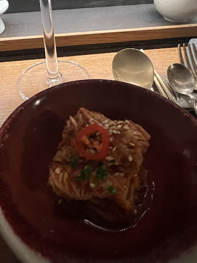 Food Most of the six courses were disappointing. I probably have to disclose that I enjoy lots of different Asian kitchens, and specifically spicy, hot and soy- or garlic-flavoured food. The starter (chestnut rice porridge) was not bad and probably the most balanced and surprising, especially for a cold winter evening. The second (one-bite vegetable salad) quite boring and the vegetables a bit too hard. The third/main courses were ok - beef steak or spicy pollock - especially the latter an authentic dish with good balance and interesting flavours. The meat however, is something that was nice to eat, but not special in itself, something that one could get at any steak restaurant. The fourth course disappointed us greatly, it was a noodle soup with kimchi and chicken. Being regulars at ramen restaurants in DĂŒsseldorf and also enjoying cooking lots of Asian noodle soups at home, we felt it was just a lukewarm, underwhelming and somehow bland version of any of these, with too little broth and noodles. The last course (choux craquelin) in itself is not bad, but could greatly benefit from more and colder filling, addition of some kind of sweet fruit maybe, and a fork instead of spoons to eat it.
