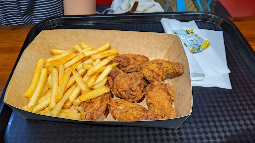 The french fries however dont taste as good as they look, kind of oversaturated and not seasoned. The chicken however has a very good goldish look and the sauces they offer with the chicken are also very good. I personally really enjoy the chicken bits with their cheese sauce. The prices are also very fair and they dont rip you off for drinks. Dining options are inside and outside, the seats inside were comfortable and the mood was settling. All in all I can recommend it for...