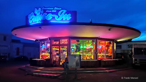 Read moreHunger in Spandau - was tun? Als Touri eben schnell mal via Google Maps das nächste Restaurant rausgesucht und auf dieses urige American Diner gestoßen... Da ich zum ersten Mal dort war, wollte ich auch ein wenig den Bewertungen meiner Vorschreiber auf den Grund gehen: der Charme ist zweifelsohne durch die liebevolle Einrichtung und den rondellartigen Bau gegeben - man muss sich jedoch die Lage direkt in einem (leider sichtbaren) Gewerbegebiet einfach mittels der flotten 50ties Rock´n Roll Songs wegträumen, die da im Hintergrund nostalgisch vor sich hin dudeln. Auch originell: man nimmt auf alten Autositzen Platz, die allerdings eine gewisse Standfestigkeit vermissen lassen. Am Service konnte ich so rein gar nichts zu meckern haben (was ich sonst zum Leidwesen meiner Mitgäste öfter mal habe...): Das Mädel von der Bedienung kam sofort zu meinem auserwählten Tisch und säuberte umgehend Tisch und Sitze, die die Vorsitzer in bedauernswertem Zustand hinterlassen hatten. Die Speisekarte kam umgehend, die Bestellung wurde flott und freundlich aufgenommen, und das richtige Essen samt Getränken kam trotz mittlerer Auslastung des Ladens zügig und in der richtigen Reihenfolge wider dem knurrenden Magen auf den Tisch. Absoluter Oberhammer mit Hang zum Kultstatus: die Milchshakes!!! Ich hatte einen in Blaubeer, LECKERST!!! Die Hot Chilli Poppers als Vorspeise wurden mit Ketchup und scharfem Gewürz gereicht, und der Hühnchen Burrito war auch innen heiß und außen mit Käse überbacken. Alles zusammen noch mit einer Cola light 0,2l hat zusammen 14,50€ gekostet - ein, wie ich finde, sehr fairer Preis, zumal ich satt geworden bin. Wen es nicht stört, dass die Mädels von der Bedienung nicht ganz dem Stil der amerikanischen 50er Jahre entprechen und sich somit nicht hundertprozentig in die ansonsten stilsichere Einrichtung einfügen, sondern wohl eher der schwarzen Szene der Jetztzeit zugerechnet sein wollen, der kann mit dem flotten Service inklusive Lächeln (!!! Nicht selbstverständlich in vielen anderen Restaurants!!!) echt zufrieden sein. Leckeres Tex-Mex-Food, die Milchshakes ein Alleinstellungsmerkmal, die Einrichtung ein Hingucker, der hilft, den Blick vom Gewerbegebiet dauerhaft abzuwenden, und wenn dann noch die ausrangierten Autositze für sich etwas schwungvoll platzierende Gäste mit Sicherheitsgurten ausgestattet werden, dann ist dieses Diner auf jeden Fall eine Reise in die...