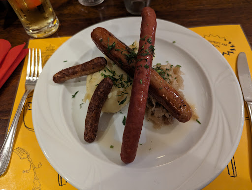 Menyen hadde et godt utvalg av typisk tysk husmannskost til det vi opplevde som fornuftige priser. Rettene på menyen var også oppgitt på engelsk i tillegg til tysk, noe som ble opplevd som positivt. Vi valgte å bestille henholdsvis «Fritzen’s Wurstparad» og «Stekt kyllingfilet med pommes frites»