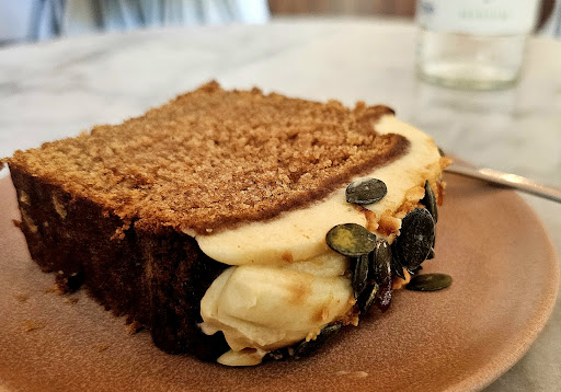Read more4.4* is about right for this über cöol café. It's a vibe as calming as camomile and as earthy as dirty chai. So, that's a great start. The service is puppy friendly and berlin confident, so that works too. The coffee is well made, but a little thin and bitter. I didn't get to examine the beans. I'll head back for an espresso to get micro. The toast was lovely, and if the abundant chervil had tasted like chervil, we'd be talking 5* with all kinds of bullets. Not their fault. Even having chervil is exciting in this stättle. The broccoli was seared, not charred? Small point, big difference in the flavour stakes. The avocado was good, which a local tells me is as rare as chervil. Fennel fronds aren't as pretty, but perhaps make the twist they're aiming for. The dressings could be more positive too. Overall though, it's a pleasant enough item...if pleasant enough is what you're up for. The pumpkin spice cake follows suit. A well thought theough and constructed surprisingly light frosting sits on top of a somewhat spiced cake that needs to be more about the butter. And a little less time in the oven if it doesn't get a mid bake dose of spiced melted butter, then this would take it up a step or 4. These are solid prices, so I've judged finikitively. But it's a...