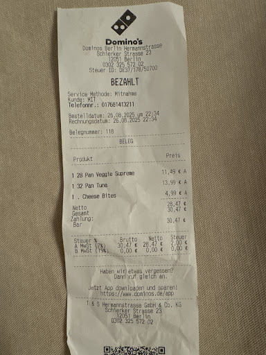 Read moreI'm from Greece and believe me dominos there is delicious. I tried the Hermanstrasse store which is the closest to my apartment. They should change all the employers. The pizza was a little bit burnt on the sides, dry and had nothing to do with the dominos pizza I know. They didn't even cut the slices properly. The delivery was fast though. Seriously guys I would prefer to eat pizza from REWE. Total waste of money. Sry to say it but in Germany I'm frustrated with the food franchises and not a single German works there so it has to...