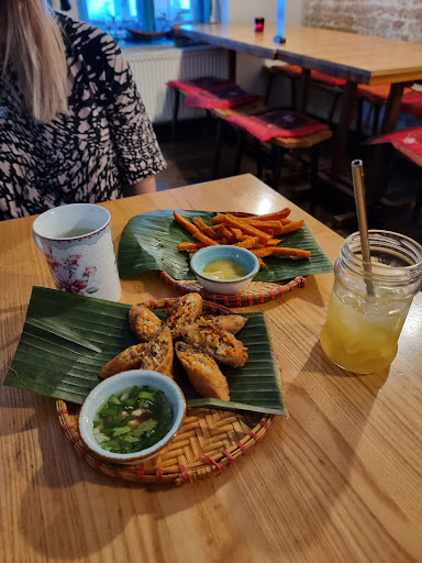 A wonderful little place with reasonable prices and good service. Nem Ran - spring rolls Crispy spring rolls, stuffed with minced meat and vegetables. Served with mint and fish sauce. Very tasty. Ga Xien - Homemade marinated grilled chicken, served with peanut sauce. This dish was delicious too. The chicken was well made and juicy. Tom Chien Com - Fried shrimp wrapped in puffed rice. Served with homemade honey-chili mayonnaise. Today’s winning dish. The shrimp was well made (not like in many places, overcooked). The crispy puffed rice. The light and refreshing sauce. Everything was right about this dish. Pho Bo - Tasty Pho soup, with beef.. Bun Bo Nam Bo - Wonderful noodle dish with marinated beef. Light and tasty. The noodles are good, the sauce is not too strong. Great dish. Com Curry Vit - Rice dish with curry and crispy duck. It's hard to find a good curry, but it was a good one. For dessert we took Banh Chuoi Nep Nuong Fried banana, tapioca in coconut milk and peanuts. The dessert was disappointing. I have nothing bad to say about it, but neither anything good. it was ok. .The homemade lemonade is also nice Definitely...