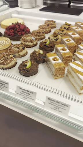 I visited this pastry shop this morning, hoping for a quick breakfast treat, but I left feeling really disappointed, especially considering the price I paid. The seating was extremely limited, a small bar with only three cramped spots inside and just two tables outside, which felt unwelcoming in the cold. To my surprise, there’s an extra charge for dining in; for example, the almond millefeuille went from 6.30 euros to 7.06 euros if you choose to sit down. This surcharge applies to all their pastries, which felt unnecessary given the minimal and uncomfortable seating options.