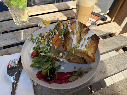 Heute hatte ich das Vergnügen, ihr Egg Drop zu probieren und ich bin noch immer begeistert von dieser kreativen Komposition. Schon beim ersten Anblick wird klar: Hier arbeiten Menschen, die Food als Kunstform verstehen. Die Art, wie die verschiedenen Texturen und Farben harmonisch auf dem Teller arrangiert sind - das geröstete Brot als perfekte Leinwand für dieses essbare Kunstwerk, die leuchtenden Gemüsestreifen, die frischen grünen Akzente und diese wunderschöne rote Sauce-Linie am Tellerrand.