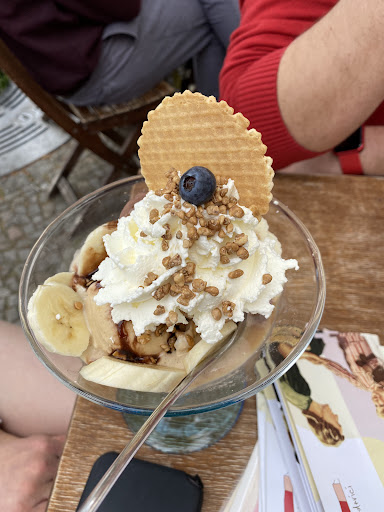 Read more... ein wirklich netter Ort. Wurden am gestrigen Pfingstsonntag draußen sehr nett bedient. Das Eis war wirklich gut (Spagetti Eis mit Eierlikör und Nüssen), obwohl wir zeitaufwändig uns erst nach Beratung zu unseren Bestellungen entschließen konnten. Zu allem Überfluss hat der männliche Teil unserer Gruppe einen Fahrradhelm der Weiblichkeit als nicht zu uns gehörig identifiziert und deshalb einfach sucherheitshalber ausserhalb zurück gelassen, was später im weiteren Verlauf unserer Fahrradpfingsttour vor dem sowjetischen Ehrenmal in Treptow einen akuten geschlechtsüberggreifenden Depressionsschub auslöste. Den haben wir wieder zurück erhalten. Auch dadurch wurde der Pfingstsonntag für uns ein perfekter Tag. Wir wurden deswegen sogar zurück gerufen. Richtig gut! Wir...