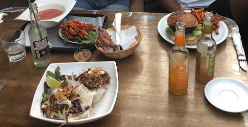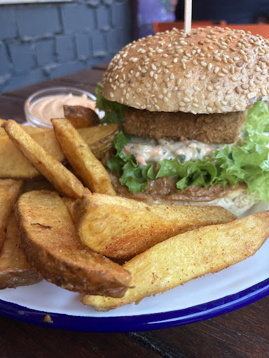 Read moreThe burger I was served had a perfectly cooked fried tofu patty with a really delicious peanut sauce. It had fresh cucumber slices and green onions on a homemade bun with seeds--a fun reincarnation of Thai peanut noodles. But the real star of the show was the fries: cut into large thin slices, served warm, soft but solid. And they came with the most excellent and spicy mayo dipping sauce. They had a bit more salt than I would've liked, but overall really really good. I'd go back here to try other things on the menu as well because they had a strong homemade/wholesome-and-satisfying theme and are located in such a cool/artsy area surrounded by colorfully...