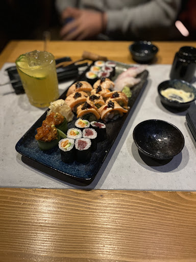 Read moreSushi-Imbiss experience with approximately 30-40 e/p.p. price on average, unfortunately. I have been to the place several times earlier, and it was better. I will not come back after today. "Mehr schein als sein" - interior design is pretty, but the food quality was disappointing. I wonder if this is targeted to a particular clientele which does not care as much for the food quality as for the design of the place: dim lights, oak benches, truffel-mayo. I don't mind that and actually enjoy a nice design, but then please provide us with ok food and keep this design well maintained. The bathroom was pretty filthy, with no option to dry hands and some weird liquid next to the toilet (pee?). The waiters were serving people and preparing sushi/making drinks at the same time, which felt strange; customers had to ask for some attention. Sushi and Nigiri quality was low - fish itself seemed fine, but the pieces were so small, with barely any rice, cut in unequal parts and sushi was often falling apart. We also ordered chicken as a starter, and one piece of it was borderline raw. According to the cook, this is how it should be, but tbh it did not feel safe to eat the semi-raw chicken, which we didn't. They were nice and did not count it into the bill, this is why I give the review 2 stars. Otherwise the experience felt somehow stressful and kind of money- and not quality-oriented: serve as much people as possible and rotate them. Perhaps they are low on staff (one of whom was very friendly), but then they should hire...