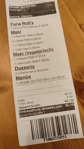 Kurz zum Fall: Gestern habe ich mir gegen 22.30 Uhr ein Lachs-Menü liefern lassen. Als mir aufgefallen ist, dass der Fisch faul gerochen (und geschmeckt) hat, war bereits die Schließzeit erreicht. Den Fisch habe ich logischerweise nicht gegessen. Als ich heute den Laden telefonisch mit dem Fall konfrontiert habe und nach den Möglichkeiten einer Kompensation fragte, wurde ich sehr rüde abgewiesen ("Gibt es nicht, dann bestell einfach nicht mehr hier. Danke, Tschüss!").