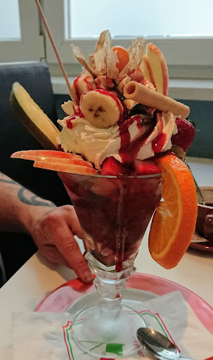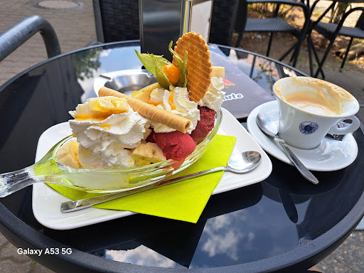 Das Eis und der Kaffee sind sehr lecker. Die Eisbecher sind groß, schnell zubereitet und schön angerichtet. Wir kommen sehr gerne hier her, sitzen meist drinnen, weil es draußen aufgrund der Straße oft laut ist und meist bereits besetzt.