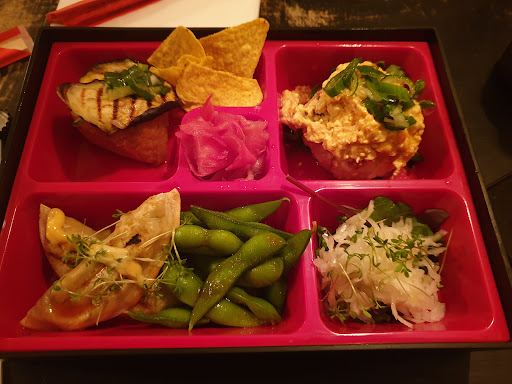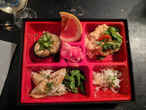 I did not even knew this place existed until I read the Still in Berlin review (google for it, links are not allowed in reviews...) This is a cute little tucked-away place that only does dinner on Wednesdays to Sundays. You also must reserve, since they only make about 40 portions each day. You can reserve by calling or emailing (gobento AT live dot de) Also, they provide free tea, but you have to bring your own drinks! Now, on to the food: there is no menu here. The chef comes to explain what he is offering today, and makes you a beautiful, lovingly hand-crafted bento box based on whether you eat meat, fish, dairy, etc. We had a sweet beancurd dumpling with aubergines, a little burger/taco filled with tender corn fed chicken, some edamame beans in a sesame and soy dressing, some home-made coleslaw topped with half a grape (great pairing). Oh, and this place also has the only pickled ginger that I have actually ever enjoyed eating! We followed it with some smoky but tender chicken skewers, and onigri topped with perfectly breaded chicken. Everything was just really delicious. Service: the owner is super friendly! However, he appears to be run the shop by himself, so there may be some waiting involved. But no worry, they have lots of games to keep you entertained, or you can read the manga that is also part of the wallpaper. Price: considering the amount of time it must have taken to prepare and assemble the bento box, it is a bargain - under...