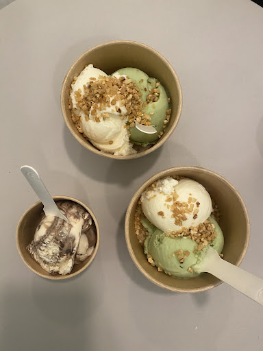 Die Konsistenz des Eises ist geradezu seidig und schmilzt regelrecht auf der Zunge. Die Portionen sind großzügig bemessen, was jeden Besuch zu einem wahren Genuss macht.