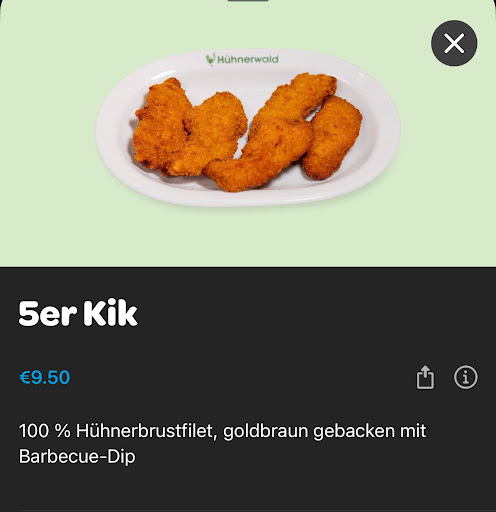Bestellung: Nr. 27 Hühnerwald Backhendl, 1/2 Hendl in vier Teile, frisch von Hand paniert, goldbraun gebacken, dazu im Menü Pommes und Getränk nach Wahl für 13,40 € oder einzeln für 8,40 €