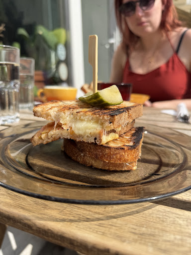 Read moreAimlessly wandering through Neukölln, since it was our designated Part of Town on a three day stay in Berlin, we stumbled upon this lovely little place. Even though it was very hot in the morning, we sat outside in the sun, with a deliciously smooth cappuccino with a fluffy croissant, a velvety Green Jasmine Tea and, because it was our holiday, two refreshing Mimosas. The Quality was more than satisfying. Already more than happy with everything, we got a little option paralysed with the choice of food.. not because the Menu was overloaded, quite the opposite was the case, but because everything on this neatly organised little List of Breakfast Dishes sounded so amazing. We ended up with the lemony peas and the kimchi grilled cheese. Oh boy. What a feast. The bread was amazing, crunchy, the kimchi was daring to have a pungent taste, and the peas were just comforting the palate in combination with yoghurt, egg, fresh herbs and a sprinkle of crispy chilli oil.
