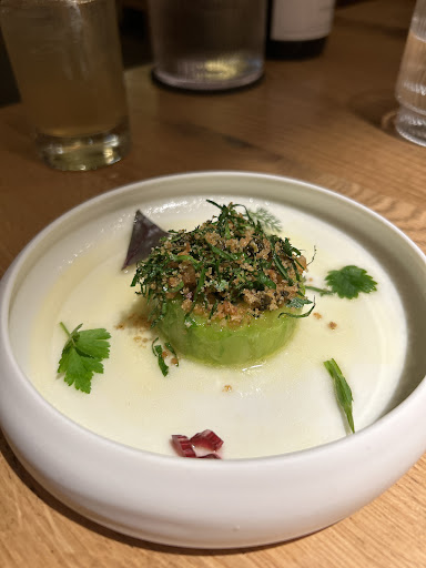 The parsley root milk is excellent. Frozen white base topped with black crushed pumpkin seeds. The pumpkin might take you to sweet thoughts. Nonono. The seeds taste more earthy. This one was the only dish that stood out. Like it was good.
