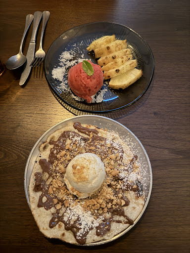Dessert included Tandoori Pineapple with Mango Sorbet and Nutella Naan. The pineapple, regrettably cold, seemed insufficiently cooked in the tandoor. Instead of mango sorbet, we were served raspberry sorbet. The preparation of the Nutella Naan suggested it was cooled to prevent the ice cream from melting too quickly, a technique that could benefit from the use of slightly fermented dough.