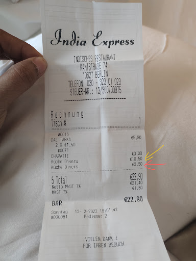 The biggest Blunder was he charged us 3.5 euros for butter naan. Even cheese naan was for 2.5 euros 🙄