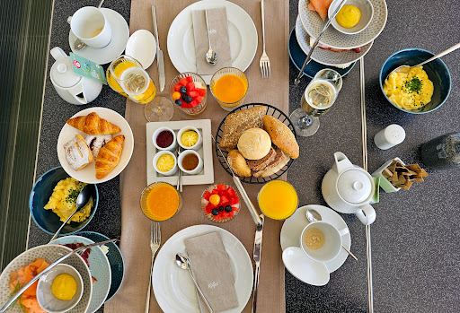 1 glass of prosecco, freshly squeezed orange juice, and coffee or tea 🥂🍊☕ A beautiful assortment of bread rolls, wholegrain bread, pastries, and croissants 🍞🥐 Homemade jams, butter, and a selection of cheeses: tête de moine, camembert, mozzarella with tomato pesto, and wild herb-mountain cheese 🧀🍅 Käfer’s beef ham, paprika turkey, smoked ham from apple-fed pigs, spianata salami, and smoked salmon with a honey-dill sauce 🥩🍖 3 scrambled organic eggs, plain yogurt with fruit sauce, and a seasonal fruit salad 🍳🍓