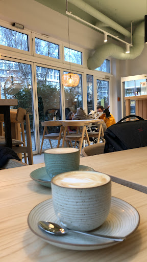 Read moreI visited today and was impressed by its minimalistic design and welcoming atmospheređ€ Coffee and cake were delicious; I tried the almond-strawberry meringue cake, while my friend tried bagel and was also satisfied. They also have a lunch menu starting from 11.30 am. Prices are above average, but acceptable. Cake was 4.90âŹ, which is more or less normal but cappuccino was 4.20⏠and latte 4.90âŹ, I found them a bit expensive. The lovely terrace was perfect for a long stay. They are also laptop-friendly and have a dedicated space with electric sockets. What stood out most was the thoughtful inclusion of a kid's corner with toys, books and a changing station and a small sink for children in the bathroom. This makes it also a perfect spot for parents, I'll definitely be back with my daughter!