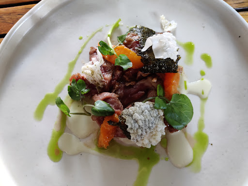 Food 4/5 For food we had two starters the eel sandwich and the iberico pork both were delicious. Only thing that was a bit weird, were the nori chips with the pork, they did not fit the dish. For mains we had the ribs. The ribs themselves were good and tender. The sauce was also good however it overpowered everything else. I wish they would have included a bit more of the sides. The parnshnip puree dots were tiny. For dessert we had the apricot semifreddo. Overall composition was nice, however the apricot semifreddo itself barely tasted of apricots.