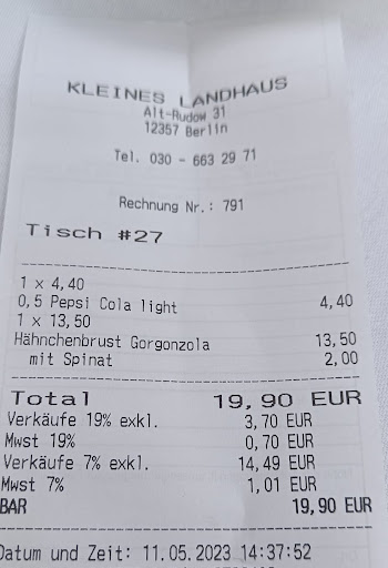 Read moreMal wieder ein Restaurant aus der Kategorie -Einmal und nie wieder- Schöner Aussenbereich und guter Aperol, leider kroch die Sonne an diesem 35 Grad warmen Tag langsam unter die Markise und ich stellte meinen Stuhl an die Stirnseite des Tisches um nicht zu verbrennen. Was das für eine Reaktion bei der Servicekraft auslöste, ist fast nicht zu beschreiben. Ich sitze nun im Laufweg und ich störe die Abläufe beim Servieren, verbunden mit einem lauten Ton. Da wir noch Freunde erwarteten, mussten wir leider sitzen bleiben, ansonsten hätte ich sofort die Rechnung geordert. So lasse ich mich nicht abfertigen. Nach einiger Zeit bekamen wir dann einen neuen Tisch und das Essen wurde serviert. Furchtbar….im Dressing ersoffener Salat und eine Fertigpizza. Selten so eine Pizza ohne Geschmack und Raffinesse gegessen. Es kam auch eine Hektik auf, die Kellner rannten, sie rannten wirklich, nach jedem Servieren zurück ins Restaurant. Nochmal furchtbar. Nächstes Drama war dann das Bezahlen. Wir hätten vorher Bescheid geben müssen, das wir mit Karte bezahlen wollen. Ach, gibt es etwa zwei unterschiedliche Rechnungen für Barzahler und für Kartenzahler? Nachtigall ick hör dir trapsen. Ob wir nicht doch bar bezahlen könnte, wurden wir erneut gefragt. Wir haben dann mit Karte bezahlt, tut mir leid , das nichts ins schwarze Schwein einbezahlt werden konnte. Dafür ist die Auswahl in Rudow zu groß um mir so etwas nochmal...