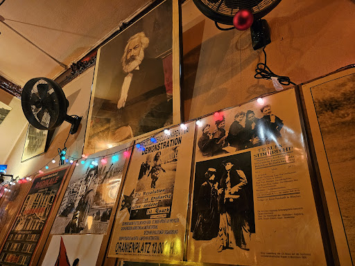 The setup is unmistakably left-wing: political posters, stickers, retro decor, and a lived-in vibe that makes you feel like you’ve stumbled into a meeting point for activists from decades past. It’s smoky inside (yes, smoking is allowed), dimly lit, and unapologetically old-school.