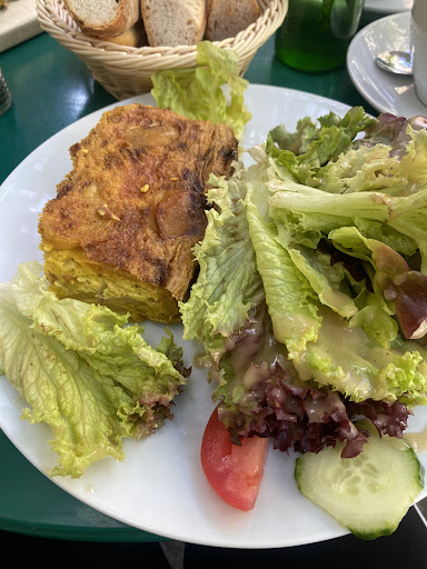 Atmosphäre: Gemütliche, einladende Musik. Nicht aufdringlich. Südeuropäisches Feeling bzw. die Lust auf den Süden wurde hier getriggert. Die ansprechende Ausstattung war aus weißem und grünen Holz und es lässt sich hier gut verweilen! Ich habe mich hier wohl gefühlt. Der Altbaucharme tut natürlich sein übriges ❣️ Und die Besitzer*in hat hier Spaß an der Verzierung von hübschen Blumen für die Tischvasen 😻