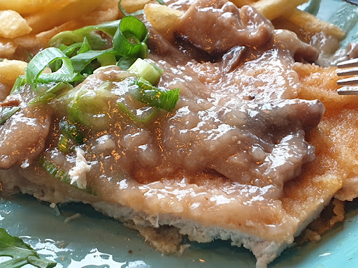 Read moreWir wollten noch schnell etwas essen, bevor es durch mömax gehen sollte. Das Schnitzel mit Letscho (9,90€) war wohl ganz gut. Ich hatte mir gegrilltes Hähnchebrustfilet mit Pommes (13,90€) gönnen wollen. Dafür sollte ich ca 20 Minuten Wartezeit einplanen. Das klang doch ganz gut, wäre dann wohl frisch. Leider war die Menge des Filet sehr übersichtlich und gegrillt war es definitiv nicht. Das Fleisch hatte eine glasige Konsistenz ohne Geschmack, sodass ich es nicht aufgegessen hatte. Auf Nachfrage, bekam ich die Antwort, das es sogar Biofleisch gewesen sein soll ?! Ich werde dort nicht wieder Essen. Für das Geld sollte man mehr erwarten können. Zumindest scheint es nicht schlecht gewesen zu sein. Dann lieber wieder ein bisschen weiter bis zu Edeka. Dort bekommt man definitiv mehr und besseres...