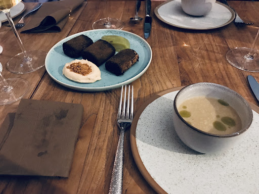 we chose the 8 course and were served: smoked leek dashi soup (complimentary, this was amazing, flavour bomb concentrate with such a warm and welcoming gesture tied to it) pastrami with bread, aioli spread and cabbage as a starter (felt that this wasn’t needed but the pastrami was one of the best I’ve tasted) salmon ceviche (unfortunately this dish was lost on me, it was probably the carrots and how the sauce was way too acidic and nothing to hold it down, the salmon quality was also below average…) leek, beetroot & saffron cream (this was amazing, the saffron cream was delightful) pimentos de padrón (the orange and cheddar seemed strange to me at first but somehow it works, I wished they used lemon instead of the orange for acidity as I felt the orange was too sweet) croquette with celery & chimichurri soup, the croquette + whatever sauce was underneath was so good one of my favourites of the menu main course of king oyster mushrooms with chili & salad, wonderful all together desserts: sour cream, apple, gochujang & honeybread, with uta pear in white chocolate and pumpkin seeds, the latter dessert...