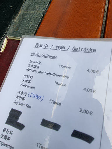 Read moreEssen ist eine Geschmackssache. Das fällt besonders Bein Besuchen ohne Erwartungen auf. Meine Tochter war hin und weg. Ich habe es unter "durchschnittlich" verbucht. Innen kann man nur geimpft essen. Doch an einem der letzten schönen Tage im Spätsommer, konnten wir zwei von acht Außenplätze in Beschlag nehmen. Kurz danach kam eine nette Bedienung. Meine Tochter bestellte eine Cola Light und gebratene Maultaschen mit Gemüse- und Fleischfüllung, dazu Sojasauce als Dip und pikante Gurken, Kirche sowie kleine angebraten Kartoffelecken und eine kleine Portion Sojabohnen(2). Geschmacklich gut. Erinnerte mich an Gebackenes Wantang. Ich dachte in Korea sollte man Reis-Grünentee(3-4) trinken. Leider im Beute, schmeckte es nach trockener Gesundheit mit Wasser. Also setzte ich mein Hoffnung in Suppe mit Reiskuchen, Maultaschen und Rindfleisch (4/2). Wie hatten noch nie Reiskuchen gegessen und so war ich etwas überrascht. Die sehr feste Kosestenz hat nur die Geschmacksneutralität mit Reis gemein. Die sämige Brühe war auch ( für mich) eher nüchtern. Sie war mit Karotten, zwei großen Maultaschen und eine handvoll Rindfleisch angereichert. Und hier trennte uns beide der Geschmack. Ich eher 4 und sie eher 2+. Ok. Geschmack ist was einem schmeckt. Nun galt es. Hop oder Topf. In dem Fall Pfanne. Und die war richtig heiß. Reis mit Feuerfleisch (Rind) Gemüse, Spiegelei und Chilipaste(3)Würzig wird das ganze mit der Chilipaste aus der Flasche. War also leider auch nur ok. Hatte vielleicht doch irgendwas anderes, unterbewusst, erwartet. Mir fehlte ein bisschen mehr Pfiff. Doch alles in allem war es gut. Die Bedienung sehr freundlich und aufmerksam. Die Gartenstuühle und passenden Tische waren sauber. Das Klo lädt zwar nicht zum Einzug ein, doch es war auch sauber. Also selber rein und probieren.