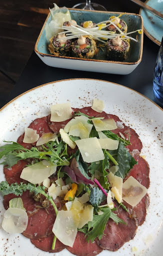 Speisekarte und Eindeckung sind sehr einfach gehalten. Wir hatten die "Kleine Reise" fĂŒr zwei Personen bestellt und wurden fast vollstĂ€ndig enttĂ€uscht. Die "Mavericks Roll" war auĂen knusprig, jedoch insgesamt fade im Geschmack. Das "C. Red. Beef Carpaccio" lieĂ den Kaffee höchstens erahnen und war ob der wunderbar fein geschnittenen Scheiben zu stark mit Salz bestreut. Konsistenz und Geschmack waren vollstĂ€ndig verlorengegangen. Das Roastbeef war schwer zu kauen und auch zu stark mit Salz bestreut. Dazu wurde Rote Beete PĂŒree gereicht. Als sich auf der Zunge ein mehliger Klumpen auflöste, war ich fast sicher, dass die ungewöhnlich helle Farbe und der lasche Geschmack von Kartoffelbreipulver und Rote Beete Saft herrĂŒhrten. Nebenan war noch ein strohiges Chimichurri zu finden. Nun ja. Die gebackene SĂŒĂkartoffel war seltsam glasig und wĂ€ssrig und auch mit zu viel Salz bestreut. Das "English Pea Hummus" zersetzte sich in seine Bestandteile - einer ölig, einer sauer. Man möchte nicht vermuten mĂŒssen, dass das Ganze "gekippt" war. Der "Caesar Salad" war knackig und im Grunde gut. Nur sehr schade war, dass hierzu, wie auch zu allen anderen Gerichten nicht eine der groĂen PfeffermĂŒhlen, die wir spĂ€ter in einer Ecke des Restaurants entdeckten, angeboten wurden. Dies sollte zum Service gehören und hĂ€tte geschmacklich vielleicht sogar noch etwas herausreiĂen können. Zum Nachtisch verspricht die "Kleine Reise" eine Dessert-Variation. Weit gefehlt! Man durfte ein Dessert von der Karte auswĂ€hlen. Freundlicherweise durften wir ob unserer EnttĂ€uschung zuvor zwei Desserts auswĂ€hlen. Der Brownie war trocken und sehr dunkel in der Farbe, schmeckte allerdings nur wenig nach Kakao. Immerhin war die Dekoration ansprechend. Die Joghurt-Creme Brulee war gelungen und wurde freudig aufgelöffelt. Das Personal versuchte teilweise unserem Unmut zu begegnen, hatte aber nicht den Mut oder die Erlaubnis, sich stĂ€rker fĂŒr die Zufriedenheit der GĂ€ste zu engagieren. Alles in allem sehr schade und ein starker Abfall in der QualitĂ€t innerhalb von...