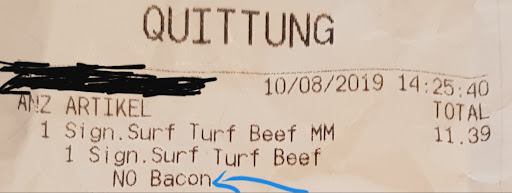 Today was the last time I'll eat at any McDonald's ever. I ordered sign surf turf beef menu with no "BACON". for 11,39 First of all the sandwich wasn't like the picture at all !!! And when I started to eat it, I found small pieces of "BACON" inside it!!! And that means they didn't make a new sandwich for me, they only remove some of the bacon from it !!!! I looked at the box to be sure, and I found the word no bacon!!! I went to the lady at the counter and I gave her the sandwich telling her the problem, she didn't say a word just took it and went a way then I said thanks I really don't want anything from you, and I went back to my seat. I stayed there with my friend and our kids for about 15 minutes and no one came to me and say any...