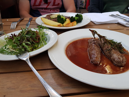 Das Saltimbocca war zart, hervorragend mariniert und auf einer sehr verführerischen Sauce mit den passenden bissfesten Beilagen aus frischem Gemüse bzw. Kartoffeln.