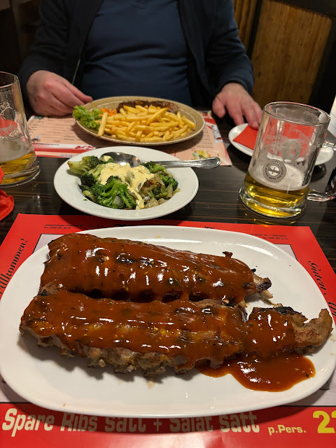 Przystawki - zupa pomidorowa takie 3/5, nie była doprawiona jakoś szczególnie, raczej mniej niż bardziej. Smażony Camembert też wydał mi się trochę bez smaku, ogólnie za dużo tego wszystkiego jak na przystawkę, ale już taki niemiecki styl, ok 🤭