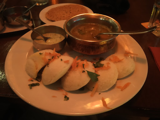 Since I was eating alone, I ordered just a plate of Idli thinking it would be light, but there were 5 big pieces (wasn't a surprise, it was mentioned on the menu). It was strictly ok. They used parsley instead of corriender which spoilt the authentic taste. The sambar was not South Indian enough, just a non-sour lentil soup, and the chutney seemed like it was not made of fresh coconut (saying coz I've tried making it with desecrated coconut and coconut milk myself and it tasted the same, or maybe the coconuts in Berlin taste like that only). There was popular Indian music playing which added to the Indian feel. And I got to speak to the waiter in Hindi which quenched my thirst of being in an Indian...