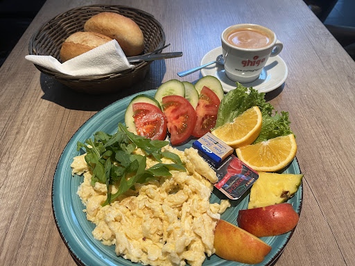 Read moreIch bewerte jetzt nur den Mittagstisch. Also hier ist viel von Glück, Zufall und der Laune des Personals abhängig, was man bekommt. Es gibt Gerichte, die sind üppig zusammengestellt (meist das Fleischgericht). Das vegetarische Gericht geht auch immer mal, meist ist es aber eine abgespeckte Version eines "richtigen" Gerichts, sprich, gibt es zB eine vegetarische Lasagne, ist viel Nudeln aber wenig Gemüse und/oder Protein dabei (Käse mal außen vor). Gibt es ein Linsengericht, ist neben dem obligatorischen Reis als Beilage nur Kartoffeln in der Soße und etwas mit Tomate angedickt. Dass ein selbstgemachter, frischer, nicht eintöniger Salat zu jedem Hauptgericht kommt, ist allerdings als besonders gut hervorzuheben. Regelmäßig Nervenkitzel bereitet jedoch die Menge der Portion. Hier geht es zu wie auf einem türkischen Basar. Hast du Glück, kriegst du eine für den Preis akzeptable Portion. Hast du in einem Viertel der Fälle Pech, dann kriegst du eine Mikro-Portion. Mach dich darauf gefasst, dass die ausgebende Bedienung rotzfest behaupten wird, dass alles in Ordnung ist. Kommt man "relativ spät" (also so ca ab 12:45) ist nämlich das bessere Gericht meist schon komplett weg. Dann kriegst du nur noch das larifari Gericht wie oben beschrieben, natürlich zum gleichen Vollpreis. Dazu kommt, dass direkt nach der Aufgabe der Bestellung die Kollegin wie ein Inkassowart die Hand ausstreckt und dir das Geld abfordert und dich damit auch von der u.U. zu kleinen Portion ablenkt. Das Ganze nutzen sie noch mehr aus, wenn mittags eine Schlange steht, frei nach dem Motto "mach mal hin, du hältst hier den Laden auf mit deinen Spirenzchen". Auch sind die Bedienungen nicht zwangsläufig freundlich. Eher so nach dem Motto "wenn's sein muss / Kunde droht mit Auftrag / ich wäre jetzt viel lieber ganz woanders" Genau hinschauen sollte man auch, was im Essen geliefert wird. Heutige Überraschung: im Pilz-Gulasch war nicht ein Bröckchen Fleisch... also nur Pilze lol Ich denke, sie profitieren von der Situation, da es wenig Konkurrenz in der Gegend gibt. Wären die oben beschriebenen Zustände nicht, wäre es sonst absolut zu empfehlen. So bleibt es aber eine regelmäßige, unnötig nervige...