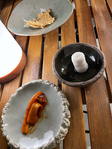 The plating is exceptional in this restaurant. All of the food is served on hand built ceramics which is pretty beautiful. The flavors are really authentic to Korea. There were some novel use of fermentation which I quite enjoyed. There were some tastes that I had actually never experienced before as someone that has both visited Korea and also had Korean heritage. Having said that to be honest, I wasn’t blown away by the main courses. We had both vegan bebimbop as well as the Neck of the pork today. From the other reviews, it sounds like the food is rotated so perhaps this is a non-issue from other meals but when I go to a fine dining restaurant, I really would like for there to be something special in the main course. My main course was the vegan Plate and it was just some small Bachchan with some rice served with a radish top soup and some vegetable based sauce. I’ve had Korean food and a lot of different context and to be honest I’ve had a lot of bibimbop in my life and it’s one of my favorite dishes. This one just didn’t do anything for me. The tofu dish right before it was also just OK. The tofu is handmade, but you can get handmade tofu pretty abundantly in Seattle, where we’re from so again, it was hard to justify that this was an entire dish. Perhaps in Berlin this is more novel and I understand that due to a different audience this might be really interesting but for me, it was just OK. If you’re not used to a lot of Korean food, it was a great experience. I’m sure because it was really for the most part. Well done. I love the fact that they have natural wines as a wine pairing. I did like all of the wines except for the last one and I really like the mission that this restaurant has so I really wanted to give it five stars, but I...